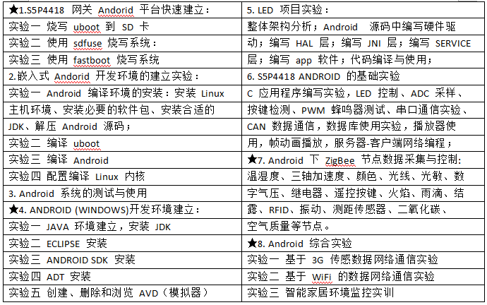 7、基于 WiFi/BT 的網(wǎng)絡通信開發(fā):可以開展 WiFi/BT 通信原理、WiFi/BT 模塊驅(qū)動開發(fā)、WiFi/BT 模塊原理設(shè)計、WiFi/BT 互聯(lián)網(wǎng)接入、WiFi/BT 移動通信與物聯(lián)網(wǎng)應用開發(fā)等。