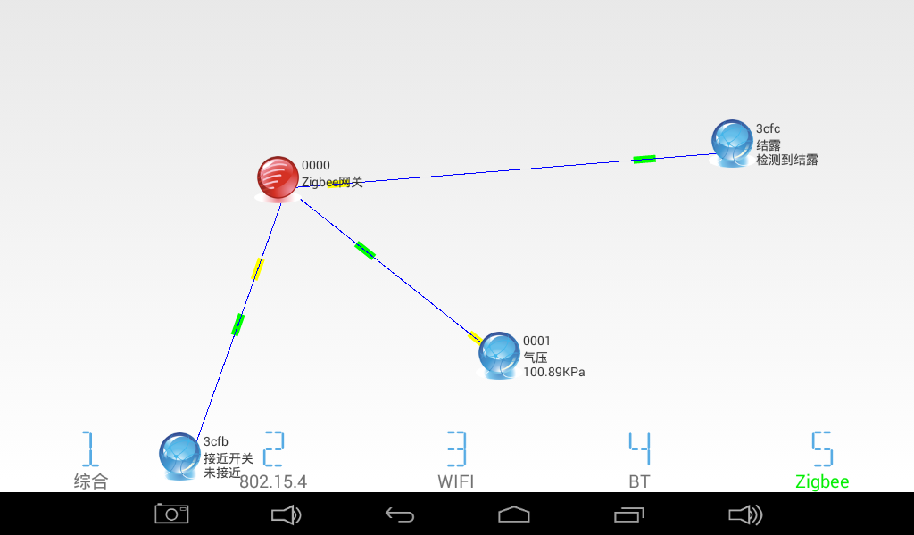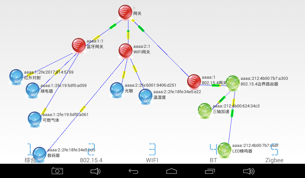 網(wǎng)關(guān)應用軟件通過CoAP服務和串口服務,將WiFi、藍牙、IEEE802.15.4、以及ZigBee感控節(jié)點數(shù)據(jù)解析處理,在網(wǎng)關(guān)的Mesh拓撲圖中實時流動地顯示傳感器數(shù)據(jù)的上、下行走向;