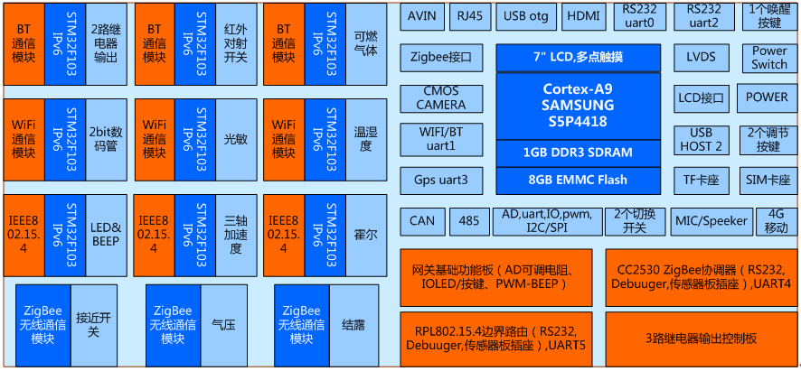 一、整體要求 1)能夠滿足單片機接口及應用、傳感器接口及應用、無線傳感網(wǎng)、嵌入式操作系統(tǒng)開發(fā)、嵌入式Linux應用開發(fā)、Android移動應用開發(fā)等課程要求。 2)能夠組建藍牙、WiFi、IEEE802.15.4、ZigBee四種無線網(wǎng)絡,實現(xiàn)數(shù)據(jù)的無線傳輸; 3)能夠?qū)⑺{牙、WiFi、IEEE802.15.4無線網(wǎng)絡經(jīng)IPV6協(xié)議、Zigbee節(jié)點經(jīng)ZStack協(xié)議融合在一個拓撲圖中,在界面上顯示藍牙、WiFi、RPL802.15.4、ZigBee等節(jié)點的傳感器數(shù)據(jù)或執(zhí)行器狀態(tài),并實時流動地顯示各個傳感器數(shù)據(jù)的上、下行走向; 4)要求藍牙、WiFi、IEEE802.15.4三種傳感器節(jié)點均具有唯一的IPv6地址,統(tǒng)一采用IPv6協(xié)議組包通信。 5)要求網(wǎng)關(guān)支持Linux、Android雙操作系統(tǒng),支持一鍵燒寫、一鍵切換。 6)要求在保證網(wǎng)關(guān)接入互聯(lián)網(wǎng)的前提下,能夠配置接入云服務平臺,并實現(xiàn)移動端傳感器數(shù)據(jù)的采集顯示和執(zhí)行器的遠程控制。 二、硬件資源 1.Cortex-A9網(wǎng)關(guān)(1個) 1)核心板資源: (1)CPU:Cortex-A9四核心的Samsung s5p4418,主頻1.4GHz; (2)GPU:MAIL-400,3D圖形加速 (3)內(nèi)存: 1GB DDR3; (4)EMMC: 8GB; (5)核心板+底板設計:核心板加裝屏蔽罩,郵票孔方式與底板連接,抗干擾能力更強,比插針式更穩(wěn)定可靠。要求引出核心板信號線,不少于188PIN。 2)網(wǎng)關(guān)主板資源: (1)LCD接口:7寸IPS電容屏(16:9),分辨率1024×600; (2)USB接口:2路USB_HOST 2.0輸出,1路USB OTG; (3)Ethernet接口:核心板內(nèi)置千兆IP,外加不超過3RMB的PHY芯片即可,支持10/100/1000M,RJ45接口; (4) 串口:2路3線RS232,1路TTL接口,1路RS485,1路Bluetooth; (5)CAN總線接口:1路; (6)RS485總線接口:1路; (7)HDMI 接口:HDMI1.4a,*大支持1920*1080高清數(shù)字輸出; (8)LVDS液晶屏接口:單通道,*大支持1920*1080; (9)攝像頭接口:1路CMOS并行接口,*大支持800萬像素; (10)AV接口:1路模擬視頻母口輸入; (11)外部存儲擴展接口:SD卡、TF卡接口; (12)音頻接口: 1路MIC輸入,1路1. 8w喇叭; (13)按鍵:1個復位按鍵、1個休眠喚醒按鍵,2個音量鍵; (14) 藍牙WiFi:板載藍牙WiFi二合一模塊; (15)Mini PCIe接口:標準可插入4G通信模模塊; (16)24Pins應用擴展接口:用于處理器外設接口擴展功能,包含3路串口、1路PWM、1路IIC、1路ADC、8個GPIO,5V電源。 2.網(wǎng)關(guān)IO基礎(chǔ)擴展板(1個) 由網(wǎng)關(guān)直接驅(qū)動。采用HC595串入并出特點,使用較少IO擴展更多功能,默認地址0x01。1路可調(diào)電位器模擬AD采樣通道,1路PWM驅(qū)動的蜂鳴器,5個觸摸按鍵,5個LED指示燈。 3.三路繼電器擴展板(1個) 由網(wǎng)關(guān)直接驅(qū)動。采用HC595串入并出特點,使用較少IO擴展更多功能,默認地址0x10。 可控制3路繼電器,線圈機械式觸點,1個常開,1個常閉,*大負載10A/277V AC。 4. ZigBee協(xié)調(diào)器(1個) 與網(wǎng)關(guān)的TTL UART連接。采用CC2530單片機外設接口、射頻通信與ZStack協(xié)議棧的方案,具備Zigbee建網(wǎng)功能,具有2個組網(wǎng)狀態(tài)及無線傳輸指示燈,2個功能按鍵,提供傳感器模塊接口、RS232接口、調(diào)試下載接口。 5. IEEE802.15.4主機(1個) 與網(wǎng)關(guān)的TTL UART連接。采用CC2530射頻功能與802.15.4的從機組建射頻網(wǎng)絡,接收從機信息,向從機發(fā)送命令。具有2個組網(wǎng)狀態(tài)及無線傳輸指示燈,2個功能按鍵,提供傳感器模塊接口、RS232接口、調(diào)試下載接口。 6.無線傳感網(wǎng)通信節(jié)點(12個) 1)微控制器主板硬件資源 (1)Cortex-M3核心主板(9個) 處理器基于ARM Cortex-M3核心的STM32F103,*高主頻72Mhz,內(nèi)部Flash 256KB,RAM 48KB。 具有1個0.96寸OLED屏,能夠顯示MAC地址、上下級關(guān)系、傳感器數(shù)據(jù)、網(wǎng)絡信息等。 具有4個組網(wǎng)狀態(tài)及無線傳輸指示燈,2個功能按鍵、1個JTAG調(diào)試接口、1個24PIN的無線射頻接口,1組20*2PIN傳感器接口; 標配ARM仿真器、串口下載仿真調(diào)試轉(zhuǎn)接板。 運行IPv6協(xié)議棧實現(xiàn)無線通信的功能。 (2)CC2530核心主板(3個) 處理器基于CC2530F256,具有2個組網(wǎng)狀態(tài)及無線傳輸指示燈,2個功能按鍵、1個JTAG調(diào)試接口、1個24PIN的無線射頻接口,1組20*2PIN傳感器接口; 標配下載仿真器。 2)無線傳感網(wǎng)通信模塊 (1)藍牙通信模塊(3個):采用UART接口的內(nèi)置協(xié)議棧方案,設置從機模式,與主機配對后,將微控制器采樣數(shù)據(jù)傳輸給主機。 (2)WiFi通信模塊(3個):采用UART接口的內(nèi)置TCP/UDP/HTTP協(xié)議棧方案,支持設置為AP、STA的工作模式,與網(wǎng)關(guān)通信后,將微控制器采樣數(shù)據(jù)傳送給主機,或者接收主機的控制命令控制執(zhí)行器。 (3)IEEE802.15.4通信模塊(3個):基于CC2530射頻組網(wǎng)通信方案,與邊界路由器組網(wǎng),實現(xiàn)傳感器數(shù)據(jù)的雙向交互。 (4)ZigBee通信模塊(3個):基于CC2530+ZStack協(xié)議棧組網(wǎng)通信方案,與Zigbee協(xié)調(diào)器組網(wǎng),實現(xiàn)傳感器數(shù)據(jù)的雙向交互。 3)傳感器通信模塊(12個) 接口至少包含GPIO/IIC/SPI/PWM/電源/地等信號。 兼容紅外接近開關(guān)、可燃氣體傳感器、繼電器控制、雙位數(shù)碼管顯示、溫濕度傳感器、光敏傳感器、LEDBEEP聲光執(zhí)行器、霍爾傳感器、三軸加速度傳感器、紅外對射傳感器、數(shù)字氣壓傳感器、凝露傳感器等??芍苯咏拥街靼鍌鞲衅鹘涌诎迳
