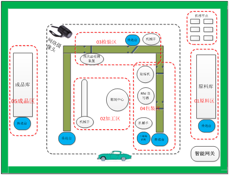 4、智能流水線控制系統(tǒng):在檢驗區(qū)和包裝區(qū)均安裝有傳送帶、到位檢測傳感器、道閘開關(guān),用來傳送加工物品,實現(xiàn)物品的自動化流轉(zhuǎn)。