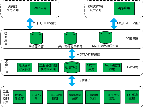 每個區(qū)都安裝有機械化生產(chǎn)裝置,通過通信節(jié)點實現(xiàn)嵌入式感知控制、無線自組網(wǎng),由網(wǎng)關(guān)上的生產(chǎn)線作業(yè)管理平臺進行本地控制,由可視化WEB平臺或移動端APP應(yīng)用為用戶提供加工環(huán)節(jié)動態(tài)界面。系統(tǒng)采用B/S架構(gòu),其架構(gòu)如圖所示。