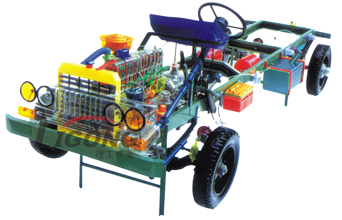透明汽車整車模型選用透明有機玻璃制作,內中部件均以硬質塑料料加工,用 螺絲固定在金屬高溫烘漆而成的車架上。各總成部分都以壓模成形加 工,代替過去膠粘合的方法,使產(chǎn)品在強度上有很大提高。發(fā)動機總成用電機驅動,在油門處設有調速裝置,能演示發(fā)動機轉速高低。離合器分離明顯,操縱靈活,離合器外殼整體壓模而成,變速箱和各檔齒輪用各種顏色表示,換檔靈活,手制動美觀。后橋外形壓模而成,內中主減速、差速轉動自如,輪轂剎蹄壓模成型,剎蹄可調節(jié),前橋輪鼓可調整,轉向裝置以及電瓶、油箱、水箱,制動管路分布清楚一目了然。電路采用對插件前后分布,燈架、風窗、儀表板、后燈架用透明有機玻璃壓模成整體美觀逼真。
