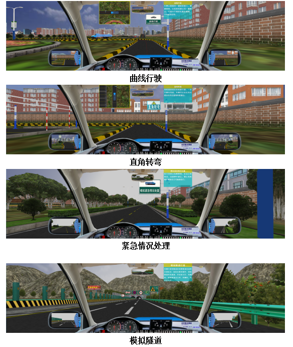 | 道路場(chǎng)景 | 炫目道路:(朝九晚五的太陽(yáng))炫目會(huì)車,炫目駕駛鄉(xiāng)村道路等。泥濘道路:泥濘洼地道路駕駛(方向、制動(dòng)、驅(qū)動(dòng)有打滑滯后感)場(chǎng)景模型取鄉(xiāng)村道路,道路變?yōu)槟酀魻顟B(tài)。石子路面:汽車在其上面行駛,遇到剎車時(shí)剎不住車,還可汽車還在繼續(xù)滑動(dòng),有時(shí)還會(huì)斜向滑行,極難控制感,汽車在石子路面里滑動(dòng)。涉水道路:涉水駕駛汽車有水流沖力對(duì)車輛的前進(jìn)阻力感光及側(cè)滑感,輪胎與水下的路壓力減小,驅(qū)動(dòng)力受到限制,使行駛受阻感覺(jué)。專項(xiàng)訓(xùn)練:要附合交通部要求。系統(tǒng)評(píng)分:每次駕駛結(jié)束,系統(tǒng)自動(dòng)評(píng)分。山區(qū)到路:突出坡多、彎多、凹凸路面、駕駛環(huán)境復(fù)雜、有側(cè)風(fēng)、有陡坡長(zhǎng)坡、溜坡、側(cè)滑(有語(yǔ)音提示)。鄉(xiāng)村道路:含鐵道路口;加油站,公交車站、單行道、農(nóng)田道口等;城市道路:含公交站臺(tái),高架立交橋、公交專用道、十字路口、丁字路口、環(huán)島、隧道、單行道、雙黃線、加油站、商場(chǎng)百貨門(mén)口斑馬線天橋,學(xué)校門(mén)口及紅綠燈,行人、非機(jī)動(dòng)車亂穿馬路及非機(jī)動(dòng)車等。高速公路:包括收費(fèi)站(入、停、出、)服務(wù)區(qū)、緊急帶、匝道行駛、超車道、行車道、隧道、立交橋、交通標(biāo)牌標(biāo)線。危險(xiǎn)場(chǎng)景:視線不清的交通情況下,超車后突然切入他人道引起被超車輛緊急制動(dòng)、自行車、行人突然橫穿馬路,路面維修,障礙物繞行等 危險(xiǎn)場(chǎng)景、 | |