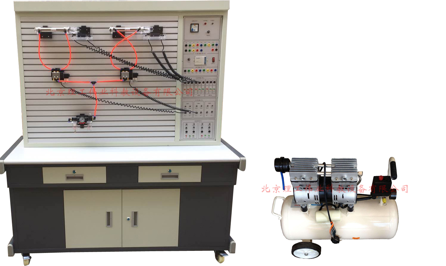 4、透明氣動(dòng)與PLC實(shí)訓(xùn)裝置采用無(wú)油靜音空壓機(jī),為實(shí)訓(xùn)室提供一個(gè)較好的實(shí)訓(xùn)環(huán)境。