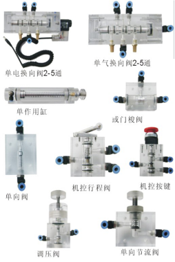 3、透明氣動(dòng)與PLC實(shí)訓(xùn)裝置各個(gè)透明氣動(dòng)元件成獨(dú)立模塊,且裝有帶彈性卡扣底板,可方便、隨意地將元件安放在實(shí)訓(xùn)面板(面板帶“T”溝槽形式的鋁合金型材結(jié)構(gòu))上。回路搭接采用快換接頭,布局靈活,拆接方便快捷。
