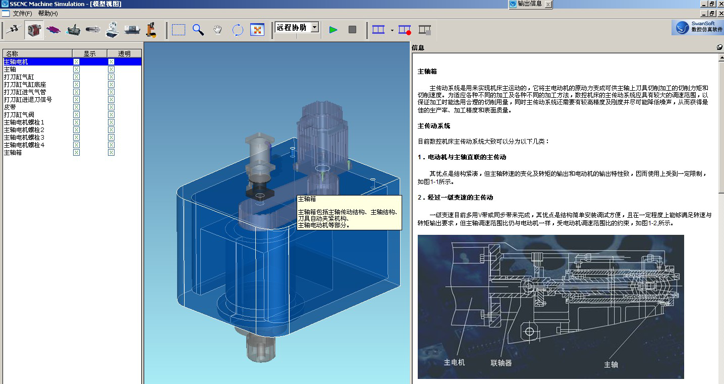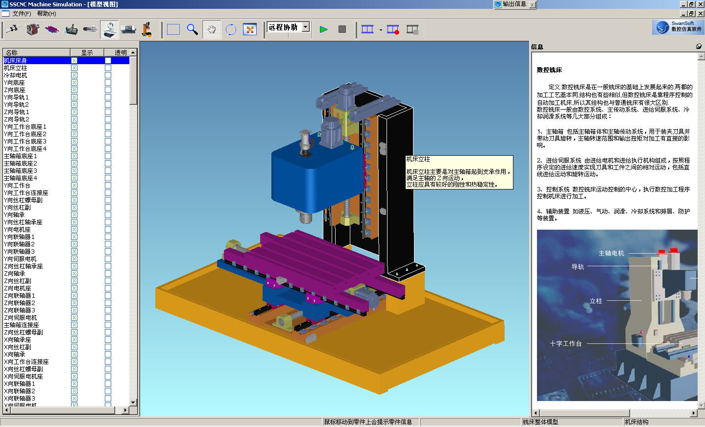 (2) 軟件具有數(shù)控車床和銑床的機(jī)械結(jié)構(gòu)展示(要求做到每一個機(jī)械部件)的3D顯示。銑床包括整機(jī)結(jié)構(gòu)、主軸箱總成、伺服總成、絲桿連接總成、Z軸總成等。