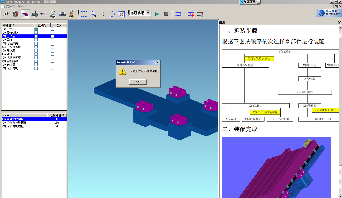 (1) 數(shù)控機(jī)床結(jié)構(gòu)包含3D數(shù)控車床和數(shù)控銑床,在結(jié)構(gòu)中能顯示零件名稱、同時可以隱藏或透明零件顯示。軟件具有虛擬互動裝配和拆卸功能,并能自動判斷拆裝操作的正確性。