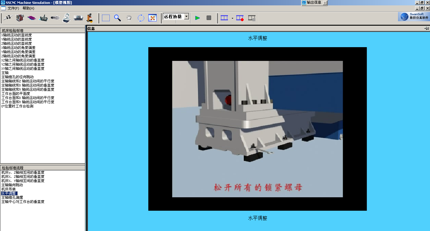 (1) 同時提供裝配的檢驗標(biāo)準(zhǔn)及檢驗流程動畫。包括:X軸直線度檢測、Y軸直線度檢測、Z軸直線度檢測、X軸角度偏差檢測、Y軸角度偏差檢測、Z軸角度偏差檢測、XZ軸垂直度檢測、YZ軸垂直度檢測、XY軸垂直度檢測、主軸錐孔跳動檢測、主軸軸線與Z軸平行度檢測、主軸軸線與X軸垂直度檢測、主軸軸線與Y軸垂直度檢測、工作臺平面度檢測、工作臺和X軸平行度檢測、工作臺與Y軸平行度檢測以及機(jī)床吊裝、機(jī)床水平調(diào)整、主軸中心對工作臺垂直度調(diào)整等。