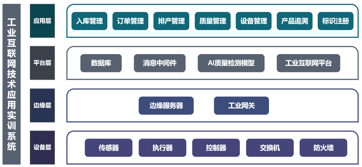 工業(yè)互聯(lián)網(wǎng)技術(shù)應(yīng)用實訓(xùn)臺采用四層架構(gòu),從底到頂依次為設(shè)備層、邊緣層、平臺層、應(yīng)用層。