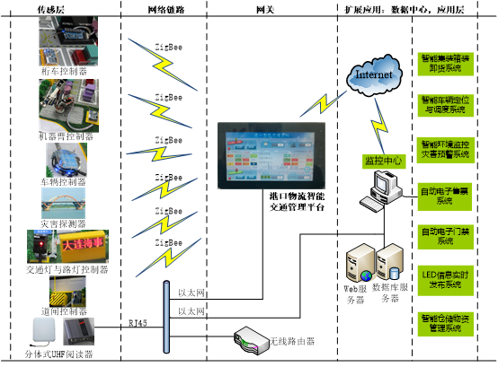 倉(cāng)儲(chǔ)物流交通實(shí)訓(xùn)系統(tǒng)覆蓋物聯(lián)網(wǎng)的傳感層、網(wǎng)絡(luò)鏈路層、網(wǎng)關(guān)、以及應(yīng)用層。智能網(wǎng)關(guān)是整個(gè)系統(tǒng)的核心,是連接傳感層與應(yīng)用層的橋梁。系統(tǒng)拓?fù)淙鐖D所示。