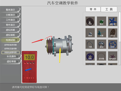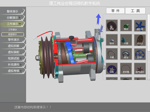 空調(diào)壓縮機(jī)虛擬仿真教學(xué)系統(tǒng) 選用空調(diào)壓縮機(jī)的實(shí)物進(jìn)行1:1的建模,從各大院校對(duì)汽車空調(diào)壓縮機(jī)的教學(xué)要求出發(fā),采用三維仿真教學(xué)風(fēng)格,空調(diào)壓縮機(jī)可以在虛擬仿真...