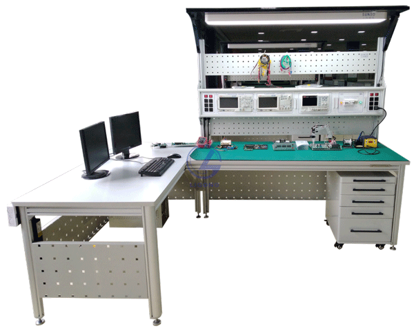 1.工作臺:桌身采用優(yōu)質(zhì)鋁型材做骨架,整機既堅固耐用,美觀大方。桌面采用25mm厚高密度纖維板,外貼防火板,PVC截面封邊,具有耐磨、耐熱、耐污、耐火、耐菌、防霉、抗靜電及易清潔等特點。工作臺設(shè)有防靜電配套裝置,桌面上方有實訓(xùn)屏、模塊盒安放橫梁、工具網(wǎng)孔板、高檔條形LED照明。