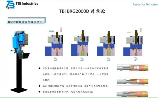 (1)德國TBi BRG-2000D清槍剪絲機構(gòu)同位置的清槍和噴油設(shè)計,機器人只需要一個信號就可以完成清槍噴油動作。