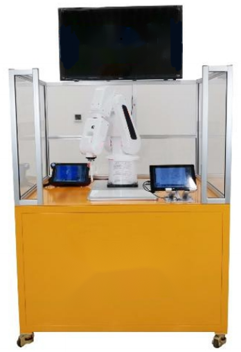 該設(shè)備采用一體化的形式,外觀簡(jiǎn)潔大氣,結(jié)構(gòu)牢固。設(shè)備下半部分使用鈑金桌體,噴漆顏色為工業(yè)黃,上半部分在鋁型材框架中裝有有機(jī)玻璃,確保設(shè)備周圍人員的安全,在框架上配備有一臺(tái)顯示器,可在屏幕上展示設(shè)備圖片或者運(yùn)行視屏等內(nèi)容。在該設(shè)備上搭載有HRT-120寫字繪畫模塊和恒銳HRP-M多系統(tǒng)編程移動(dòng)平臺(tái),機(jī)器人可將該平板繪畫板上書畫的字和圖案按原畫在畫布上重現(xiàn)。