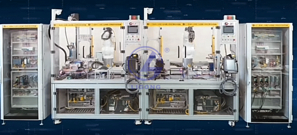 (3)設備至少包含六關節(jié)工業(yè)機器人、電氣控制系統(tǒng)、人機界面、工業(yè)視覺、安全系統(tǒng)、氣動系統(tǒng)、外圍機械功能單元組件等真實工業(yè)器件,要求實現電池模組產品封裝過程的外圍配套設備布局、安裝與調整、系統(tǒng)編程、離線編程、工藝優(yōu)化、系統(tǒng)調試等功能。