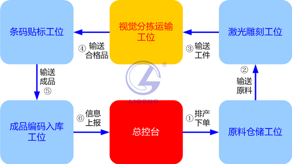 數(shù)字化工廠綜合應(yīng)用實(shí)訓(xùn)系統(tǒng),就是將物聯(lián)網(wǎng)關(guān)鍵技術(shù)、工業(yè)互聯(lián)網(wǎng)平臺(tái)技術(shù)、人工智能技術(shù)等應(yīng)用到制造企業(yè)生產(chǎn)鏈,形成數(shù)字化智能工廠系統(tǒng)。系統(tǒng)由原料倉(cāng)儲(chǔ)工位、激光雕刻工位、視覺分揀運(yùn)輸工位、包裝貼標(biāo)工位、成品標(biāo)識(shí)入庫工位、總控制臺(tái)共六個(gè)獨(dú)立工位拼裝組成,涵蓋立體庫位、堆垛機(jī)、加工流轉(zhuǎn)臺(tái)、激光雕刻機(jī)、多自由度滑動(dòng)機(jī)器手、機(jī)器視覺檢測(cè)裝置、流水線傳送帶、二維碼氣動(dòng)打標(biāo)裝置、RFID讀寫模塊、條碼識(shí)讀模塊以及安裝在設(shè)備上的壓力傳感器、轉(zhuǎn)速傳感器、工廠環(huán)境監(jiān)測(cè)傳感器、工業(yè)指示屏等工業(yè)常見設(shè)備,結(jié)合工業(yè)智能網(wǎng)關(guān)、邊緣服務(wù)器及工業(yè)互聯(lián)網(wǎng)平臺(tái),通過工業(yè)現(xiàn)場(chǎng)總線和無線自組網(wǎng)通信技術(shù),實(shí)現(xiàn)激光加工鏈的取料、寫碼、讀碼、加工、檢驗(yàn)、分揀、運(yùn)輸、貼標(biāo)、寫碼、讀碼、識(shí)讀、入庫等整體生產(chǎn)流程,達(dá)到工業(yè)生產(chǎn)跟蹤、產(chǎn)線生產(chǎn)數(shù)量統(tǒng)計(jì)、設(shè)備運(yùn)行狀態(tài)監(jiān)測(cè)、工件質(zhì)量統(tǒng)計(jì)、工件生產(chǎn)流程追溯等智慧化管理。產(chǎn)品實(shí)物圖如圖所示。
