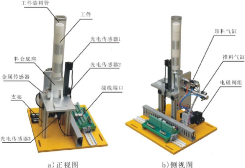 主要由井式工件庫、推料氣缸、物料臺、光電傳感器、磁性開關、電磁閥、支架、機械零部件構成。 |