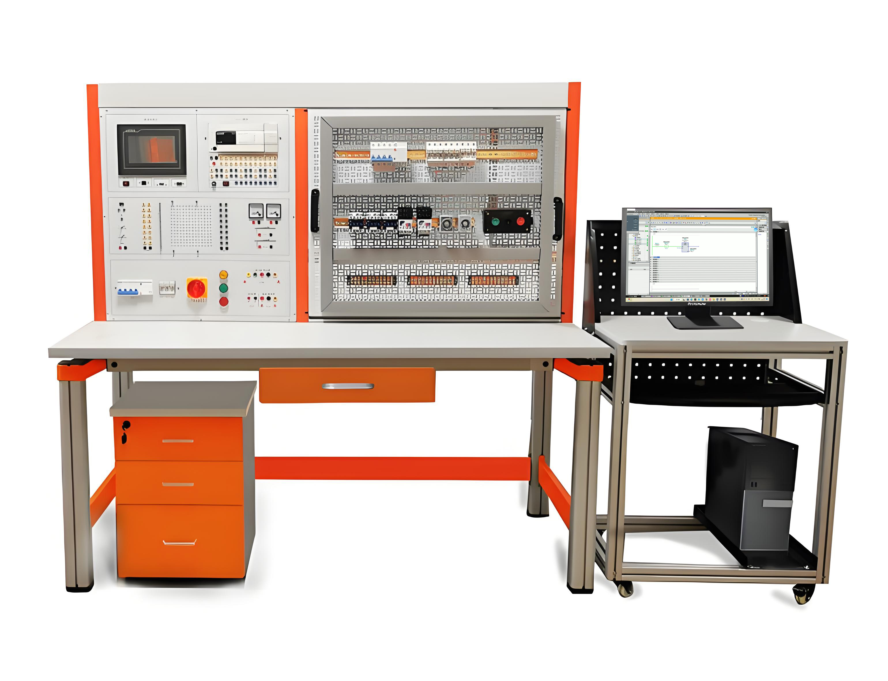 2、實訓桌:鋼木結構,桌面為防火耐磨材料制作,具有放置工具抽屜、鍵盤托、顯示器擱板。