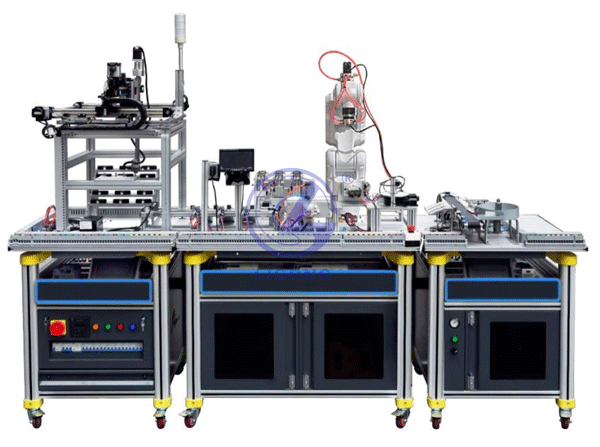 LGY-JD05B型 通用機電設備安裝與調(diào)試實訓裝備主要由實訓臺架、典型的機電設備的機械部件, 電氣控制單元等組成。典型的機電設備的機械部件主要包括供料機構(gòu)、傳送帶輸送分揀機構(gòu)、工業(yè)機器人、直角坐標機械手、立體倉庫以及可擴展的模擬生產(chǎn)設備實訓模塊等; 電氣控制單元主要有電源配電、PLC 可編程控制器、觸摸屏、變頻器、步進電機控制、伺服電機控制、按鈕指示燈、接線端子及各種檢測傳感器等部分組成。整體結(jié)構(gòu)采用開放式和拆裝式,可根據(jù)現(xiàn)有的機械部件,以模塊化的方式組裝和搭建具有生產(chǎn)功能的智能生產(chǎn)線設備,也可添加其它機械部件組裝其他生產(chǎn)設備,使整個裝置能夠靈活的按教學實訓要求組裝具有模擬生產(chǎn)功能的智能生產(chǎn)線設備。