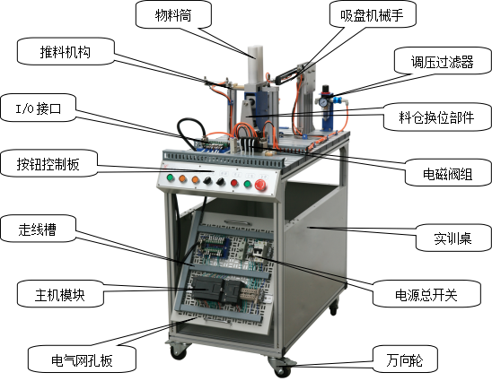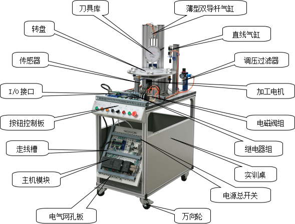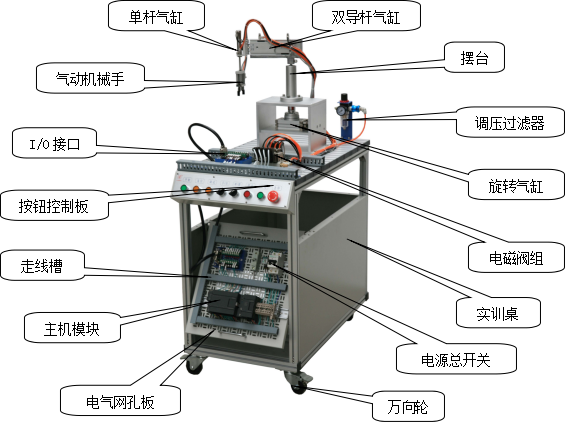 該系統(tǒng)上使用了大量的氣動(dòng)元件,包括多種電控氣動(dòng)閥、多種氣動(dòng)缸、氣動(dòng)夾爪、真空吸盤(pán)、真空發(fā)生器、過(guò)濾減速閥等。在學(xué)習(xí)這些氣動(dòng)元件時(shí),不但可以單獨(dú)學(xué)習(xí)每一種分離元件,而且還可以在學(xué)習(xí)時(shí)了解各種氣動(dòng)元件之間,以及氣動(dòng)元件與其它元件之間,如何配合起來(lái)并協(xié)調(diào)進(jìn)行工作的。