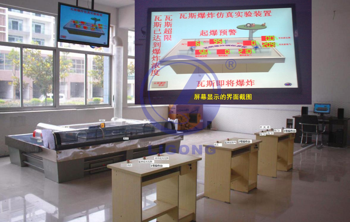 該裝置由瓦斯爆炸模擬巷道、防護(hù)網(wǎng)、煤塵實(shí)驗(yàn)裝置、監(jiān)測顯示系統(tǒng)(瓦斯?jié)舛葌鞲衅?、氧氣濃度傳感器、溫度傳感器、大屏幕液晶電視)、風(fēng)機(jī)、風(fēng)門、控制系統(tǒng)(全電腦控制)和操作臺組等成。主要根據(jù)瓦斯爆炸的必須條件和爆炸的機(jī)理,進(jìn)行人機(jī)互動模擬瓦斯、煤塵爆炸。通過三個(gè)操作臺來控制風(fēng)門的調(diào)節(jié)、風(fēng)機(jī)的開啟、瓦斯的充入及點(diǎn)火,人為分別控制三個(gè)條件的變化,即瓦斯含量、點(diǎn)火控制、氧氣含量(風(fēng)量控制),*終達(dá)到模擬爆炸的發(fā)生實(shí)驗(yàn)。在互動實(shí)驗(yàn)過程中,為了更加結(jié)合現(xiàn)場實(shí)際,每個(gè)人控制一項(xiàng)參數(shù)的變化,如果三個(gè)人中其中有一項(xiàng)達(dá)不到爆炸的條件,均不爆炸??芍苯油ㄟ^大屏幕顯示器,將瓦斯爆炸的三個(gè)條件——瓦斯?jié)舛取⒀鯕鉂舛?、點(diǎn)火溫度,同時(shí)顯示出來。通過緩慢加熱形式,可將點(diǎn)火時(shí)的溫度值顯示并鎖定。通過實(shí)驗(yàn),能直觀反映瓦斯爆炸的全部過程,使學(xué)員們既可聽其爆炸之聲,又能觀其爆炸之場景,體驗(yàn)爆炸威力之大、危害之嚴(yán)重的驚心場面,從而引起對瓦斯爆炸防范的高度重視,讓安全生產(chǎn)警鐘常鳴。