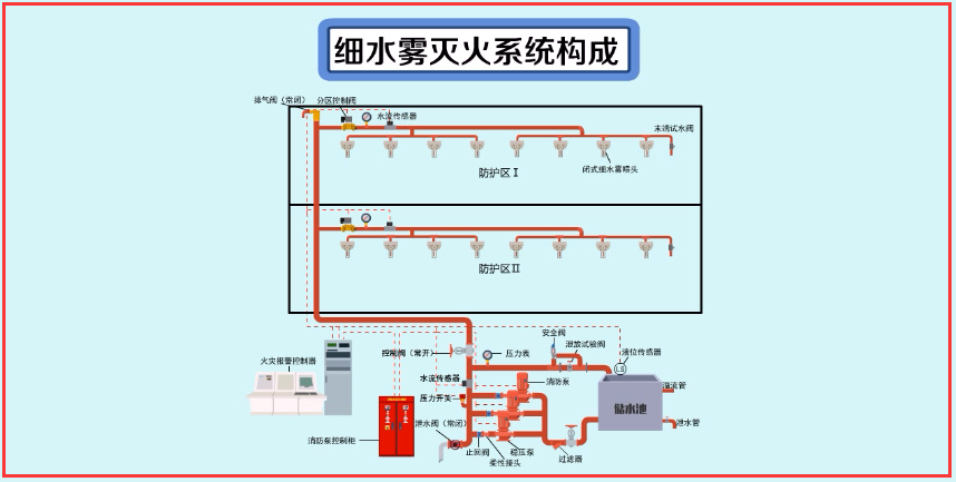 細(xì)水霧是指噴霧液體總體積重,直徑少于400μm的霧滴所占體積的百分比不少于99%,直徑少于200μm的霧滴所占體積的百分比不少于50%的微小水霧。開(kāi)式細(xì)水霧滅火系統(tǒng)包括全淹沒(méi)應(yīng)用方式和局部應(yīng)用方式,是采用開(kāi)式細(xì)水霧噴頭,由配套的火災(zāi)自動(dòng)報(bào)警系統(tǒng)自動(dòng)連鎖或遠(yuǎn)控、手動(dòng)啟動(dòng)后,控制一組噴頭同時(shí)噴水的自動(dòng)細(xì)水霧滅火系統(tǒng)。