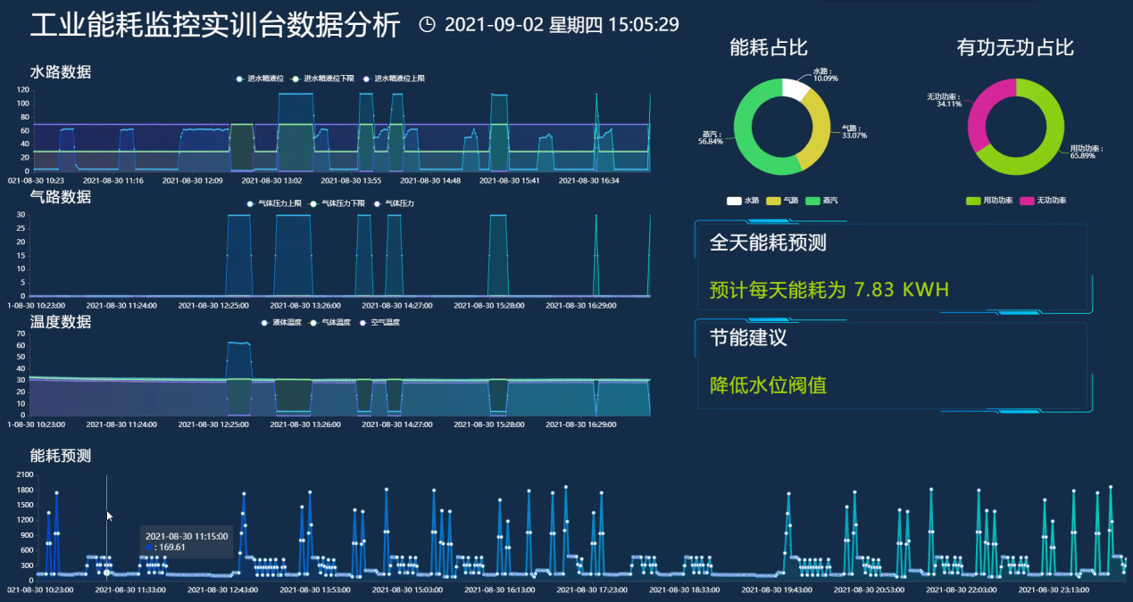 LGHL-04型 工業(yè)互聯(lián)能耗監(jiān)控實訓(xùn)臺以水、氣、電能耗監(jiān)測為背景,采用液位計、流量計、溫度變送器、壓力變送器、電磁閥、水泵、氣泵、電氣控制箱、水箱等裝置模擬工業(yè)場景下的水循環(huán)、氣循環(huán)、電能監(jiān)測常見的過程控制系統(tǒng)。其中水箱作為液體盛放和氣體導(dǎo)入的氣液混合容器,模擬化工行業(yè)常見的化工產(chǎn)品制備工藝場景。通過現(xiàn)場監(jiān)控裝置及傳輸模塊,將液位、流量、壓力、水溫、氣溫、電壓、電流、電量等過程控制參數(shù)進行數(shù)據(jù)采集,傳輸?shù)侥茉垂芾砥脚_,達到工業(yè)水、電、氣等至少三種數(shù)據(jù)采集控制、數(shù)據(jù)傳輸、數(shù)據(jù)存儲、數(shù)據(jù)分析及可視化展示的目的。