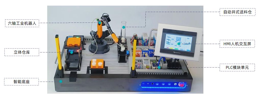 LG-JQRSX型 機(jī)器人PLC實(shí)訓(xùn)工作站由桌面級(jí)工業(yè)六軸機(jī)器人、自動(dòng)井式出料機(jī)、PLC控制模塊、立體倉儲(chǔ)單元及HMI人機(jī)交互單元組成。