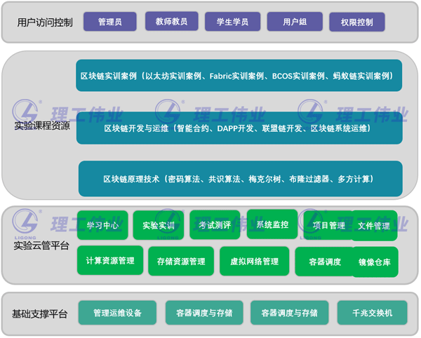 區(qū)塊鏈實驗教學(xué)平臺的的產(chǎn)品設(shè)計由下而上分為四層,即:基礎(chǔ)支撐平臺、實驗云管平臺、實驗課程資源、用戶訪問控制。