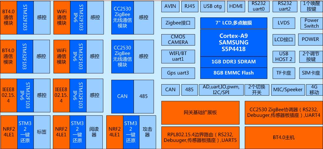 一、整體要求 1)能夠滿足單片機接口及應用、傳感器接口及應用、無線傳感網(wǎng)、嵌入式操作系統(tǒng)開發(fā)、嵌入式Linux應用開發(fā)、Android移動應用開發(fā)等課程要求。 2)能夠組建藍牙、WiFi、IEEE802.15.4、ZigBee四種無線網(wǎng)絡,實現(xiàn)數(shù)據(jù)的無線傳輸; 3)能夠?qū)⑺{牙、WiFi、IEEE802.15.4無線網(wǎng)絡經(jīng)IPV6協(xié)議、Zigbee節(jié)點經(jīng)ZStack協(xié)議融合在一個拓撲圖中,在界面上顯示藍牙、WiFi、RPL802.15.4、ZigBee等節(jié)點的傳感器數(shù)據(jù)或執(zhí)行器狀態(tài),并實時流動地顯示各個傳感器數(shù)據(jù)的上、下行走向; 4)要求藍牙、WiFi、IEEE802.15.4三種傳感器節(jié)點均具有唯一的IPv6地址,統(tǒng)一采用IPv6協(xié)議組包通信。 5)要求網(wǎng)關(guān)支持Linux、Android雙操作系統(tǒng),支持一鍵燒寫、一鍵切換。 6)要求在保證網(wǎng)關(guān)接入互聯(lián)網(wǎng)的前提下,能夠配置接入云服務平臺,并實現(xiàn)移動端傳感器數(shù)據(jù)的采集顯示和執(zhí)行器的遠程控制。 二、硬件資源 1.Cortex-A9網(wǎng)關(guān)(1個) 1)核心板資源: (1)CPU:Cortex-A9四核心的Samsung s5p4418,主頻1.4GHz; (2)GPU:MAIL-400,3D圖形加速 (3)內(nèi)存: 1GB DDR3; (4)EMMC: 8GB; (5)核心板+底板設計:核心板加裝屏蔽罩,郵票孔方式與底板連接,抗干擾能力更強,比插針式更穩(wěn)定可靠。要求引出核心板信號線,不少于188PIN。 2)網(wǎng)關(guān)主板資源: (1)LCD接口:7寸IPS電容屏(16:9),分辨率1024×600; (2)USB接口:2路USB_HOST 2.0輸出,1路USB OTG; (3)Ethernet接口:核心板內(nèi)置千兆IP,外加不超過3RMB的PHY芯片即可,支持10/100/1000M,RJ45接口; (4) 串口:2路3線RS232,1路TTL接口,1路RS485,1路Bluetooth; (5)CAN總線接口:1路; (6)RS485總線接口:1路; (7)HDMI 接口:HDMI1.4a,*大支持1920*1080高清數(shù)字輸出; (8)LVDS液晶屏接口:單通道,*大支持1920*1080; (9)攝像頭接口:1路CMOS并行接口,*大支持800萬像素; (10)AV接口:1路模擬視頻母口輸入; (11)外部存儲擴展接口:SD卡、TF卡接口; (12)音頻接口: 1路MIC輸入,1路1. 8w喇叭; (13)按鍵:1個復位按鍵、1個休眠喚醒按鍵,2個音量鍵; (14) 藍牙WiFi:板載藍牙WiFi二合一模塊; (15)Mini PCIe接口:標準可插入4G通信模模塊; (16)24Pins應用擴展接口:用于處理器外設接口擴展功能,包含3路串口、1路PWM、1路IIC、1路ADC、8個GPIO,5V電源。 2.網(wǎng)關(guān)IO基礎(chǔ)擴展板(1個) 由網(wǎng)關(guān)直接驅(qū)動。采用HC595串入并出特點,使用較少IO擴展更多功能,默認地址0x01。1路可調(diào)電位器模擬AD采樣通道,1路PWM驅(qū)動的蜂鳴器,5個觸摸按鍵,5個LED指示燈。 3.三路繼電器擴展板(1個) 由網(wǎng)關(guān)直接驅(qū)動。采用HC595串入并出特點,使用較少IO擴展更多功能,默認地址0x10。 可控制3路繼電器,線圈機械式觸點,1個常開,1個常閉,*大負載10A/277V AC。 4. ZigBee協(xié)調(diào)器(1個) 與網(wǎng)關(guān)的TTL UART連接。采用CC2530單片機外設接口、射頻通信與ZStack協(xié)議棧的方案,具備Zigbee建網(wǎng)功能,具有2個組網(wǎng)狀態(tài)及無線傳輸指示燈,2個功能按鍵,提供傳感器模塊接口、RS232接口、調(diào)試下載接口。 5. IEEE802.15.4主機(1個) 與網(wǎng)關(guān)的TTL UART連接。采用CC2530射頻功能與802.15.4的從機組建射頻網(wǎng)絡,接收從機信息,向從機發(fā)送命令。具有2個組網(wǎng)狀態(tài)及無線傳輸指示燈,2個功能按鍵,提供傳感器模塊接口、RS232接口、調(diào)試下載接口。 6.無線傳感網(wǎng)通信節(jié)點(12個) 1)微控制器主板硬件資源 (1)Cortex-M3核心主板(9個) 處理器基于ARM Cortex-M3核心的STM32F103,*高主頻72Mhz,內(nèi)部Flash 256KB,RAM 48KB。 具有1個0.96寸OLED屏,能夠顯示MAC地址、上下級關(guān)系、傳感器數(shù)據(jù)、網(wǎng)絡信息等。 具有4個組網(wǎng)狀態(tài)及無線傳輸指示燈,2個功能按鍵、1個JTAG調(diào)試接口、1個24PIN的無線射頻接口,1組20*2PIN傳感器接口; 標配ARM仿真器、串口下載仿真調(diào)試轉(zhuǎn)接板。 運行IPv6協(xié)議棧實現(xiàn)無線通信的功能。 (2)CC2530核心主板(3個) 處理器基于CC2530F256,具有2個組網(wǎng)狀態(tài)及無線傳輸指示燈,2個功能按鍵、1個JTAG調(diào)試接口、1個24PIN的無線射頻接口,1組20*2PIN傳感器接口; 標配下載仿真器。 2)無線傳感網(wǎng)通信模塊 (1)藍牙通信模塊(3個):采用UART接口的內(nèi)置協(xié)議棧方案,設置從機模式,與主機配對后,將微控制器采樣數(shù)據(jù)傳輸給主機。 (2)WiFi通信模塊(3個):采用UART接口的內(nèi)置TCP/UDP/HTTP協(xié)議棧方案,支持設置為AP、STA的工作模式,與網(wǎng)關(guān)通信后,將微控制器采樣數(shù)據(jù)傳送給主機,或者接收主機的控制命令控制執(zhí)行器。 (3)IEEE802.15.4通信模塊(3個):基于CC2530射頻組網(wǎng)通信方案,與邊界路由器組網(wǎng),實現(xiàn)傳感器數(shù)據(jù)的雙向交互。 (4)ZigBee通信模塊(3個):基于CC2530+ZStack協(xié)議棧組網(wǎng)通信方案,與Zigbee協(xié)調(diào)器組網(wǎng),實現(xiàn)傳感器數(shù)據(jù)的雙向交互。 3)傳感器通信模塊(12個) 接口至少包含GPIO/IIC/SPI/PWM/電源/地等信號。 兼容紅外接近開關(guān)、可燃氣體傳感器、繼電器控制、雙位數(shù)碼管顯示、溫濕度傳感器、光敏傳感器、LEDBEEP聲光執(zhí)行器、霍爾傳感器、三軸加速度傳感器、紅外對射傳感器、數(shù)字氣壓傳感器、凝露傳感器等??芍苯咏拥街靼鍌鞲衅鹘涌诎迳