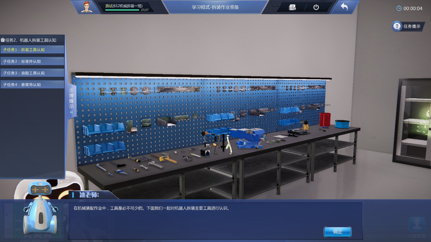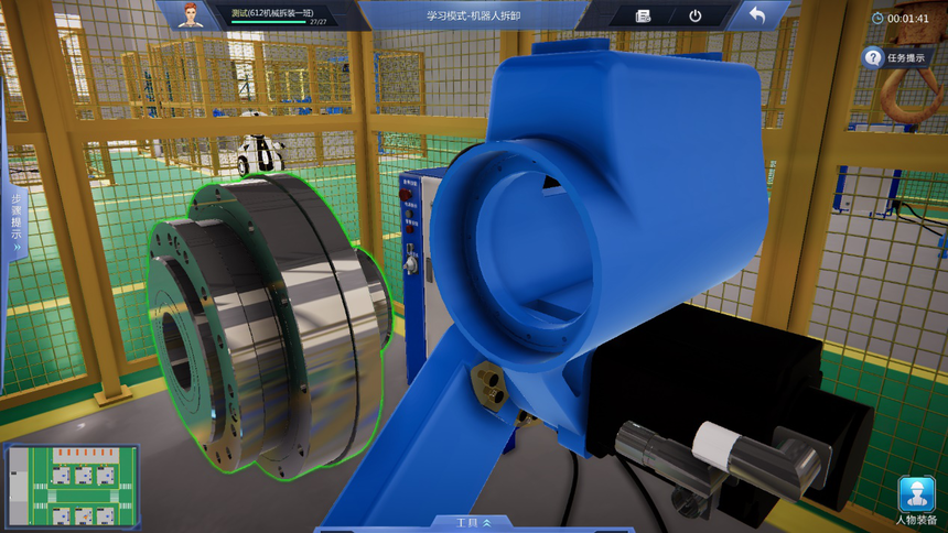 4、學(xué)習(xí)模式教學(xué)實(shí)訓(xùn)任務(wù)豐富:機(jī)器人拆裝作業(yè)準(zhǔn)備虛擬仿真實(shí)訓(xùn)項(xiàng)目包含拆裝作業(yè)防護(hù)準(zhǔn)備、機(jī)器人拆裝工具認(rèn)知、機(jī)器人拆卸作業(yè)準(zhǔn)備等至少3個(gè)教學(xué)實(shí)訓(xùn)任務(wù);機(jī)器人本體拆卸虛擬仿真實(shí)訓(xùn)項(xiàng)目包含機(jī)器人整體拆卸、機(jī)器人J6軸到J1軸的分步拆卸、諧波減速機(jī)的認(rèn)知、RV減速機(jī)的認(rèn)知等至少9個(gè)教學(xué)實(shí)訓(xùn)任務(wù);機(jī)器人本體安裝虛擬仿真實(shí)訓(xùn)項(xiàng)目包含機(jī)器人整體安裝、機(jī)器人J1軸到J6軸的分步安裝、機(jī)器人注油、軸承的認(rèn)知、軸的初步認(rèn)知等至少少10個(gè)教學(xué)實(shí)訓(xùn)任務(wù)。機(jī)器人初步調(diào)試項(xiàng)目包含調(diào)試前準(zhǔn)備、機(jī)器人開機(jī)、機(jī)器人關(guān)機(jī)、機(jī)器人基礎(chǔ)調(diào)試、機(jī)器人精度檢測等至少5個(gè)教學(xué)實(shí)訓(xùn)任務(wù)。